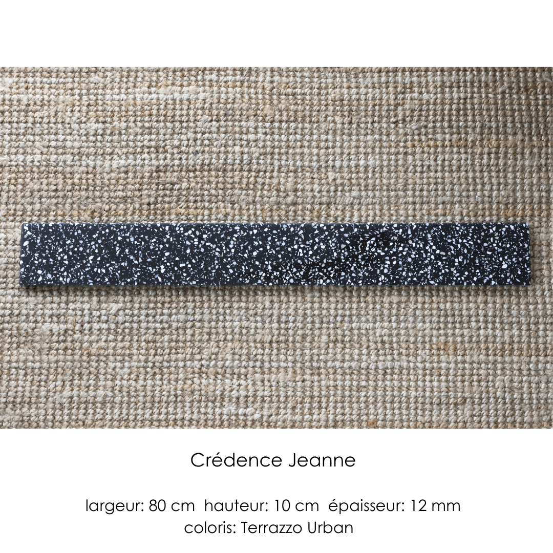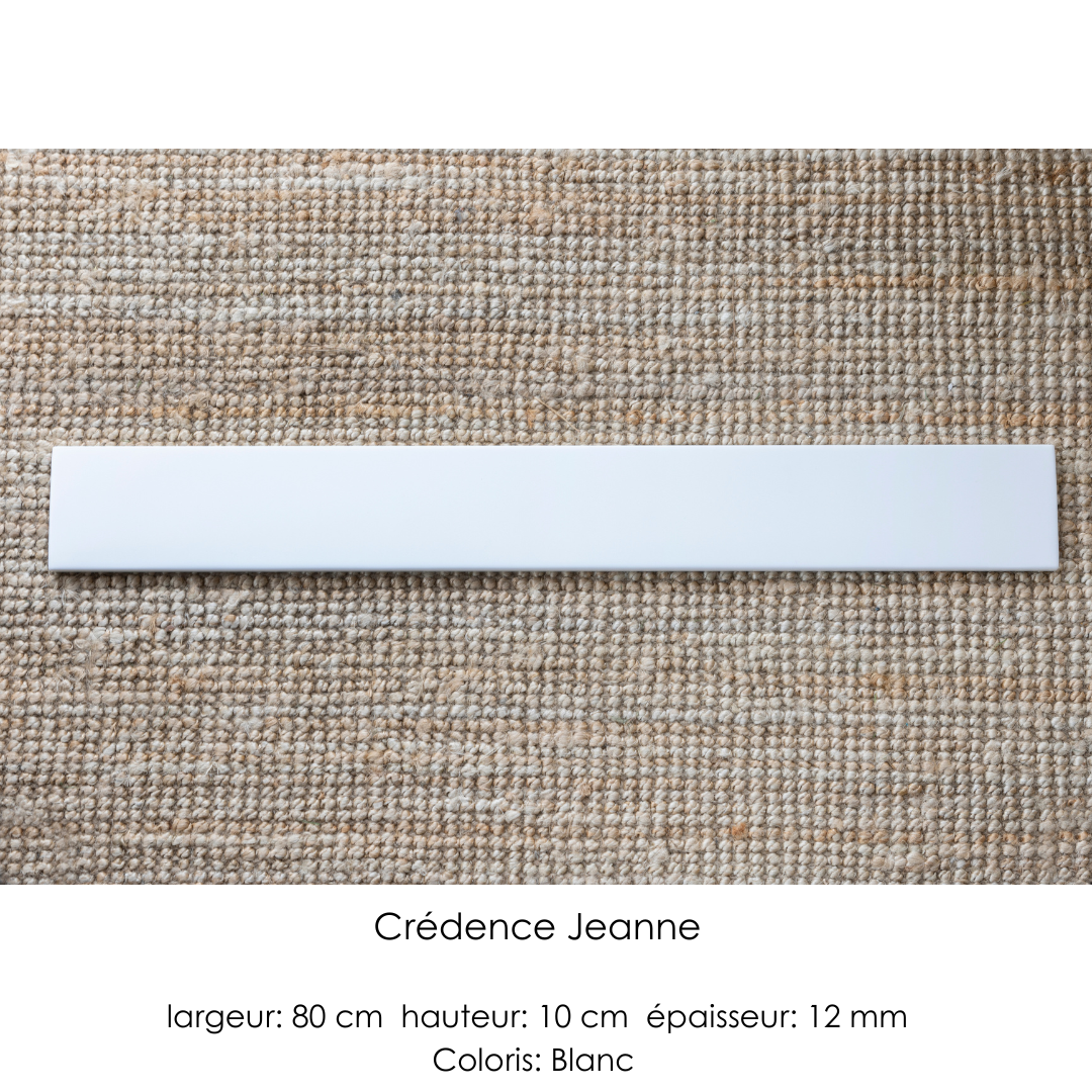 La crédence Jeanne est disponible en deux hauteurs 10 et 25 cm. Elle dispose d'une rainure, non débouchante sur sa tranche en bas, qui permet d'accueillir un joint de mastic acrylique qui permettra d'assurer l'étanchéité tout en restant invisible.