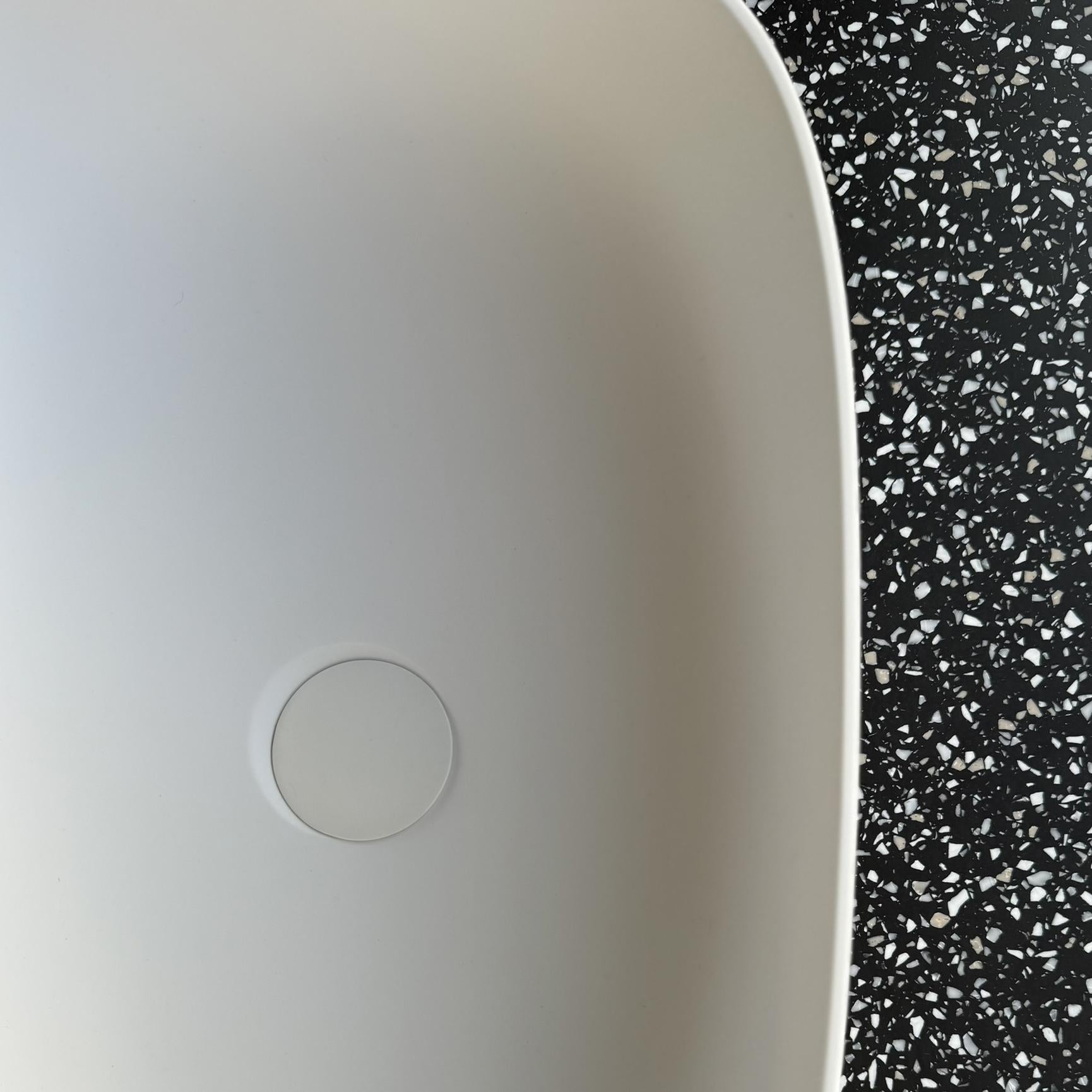 Fabriqué en matériau premium Solid Surface, type Corian®, notre plan avec vasque à poser Malo est conçu avec une vasque ovale blanche, élégamment positionnée sur un plan en Solid Surface de 5 cm d'épaisseur à choisir parmi les differents coloris proposés.
